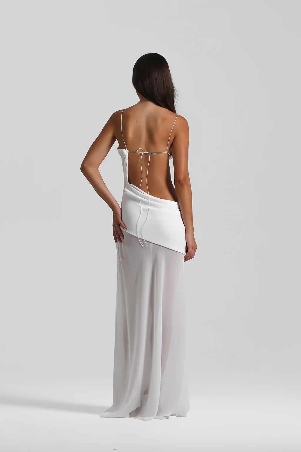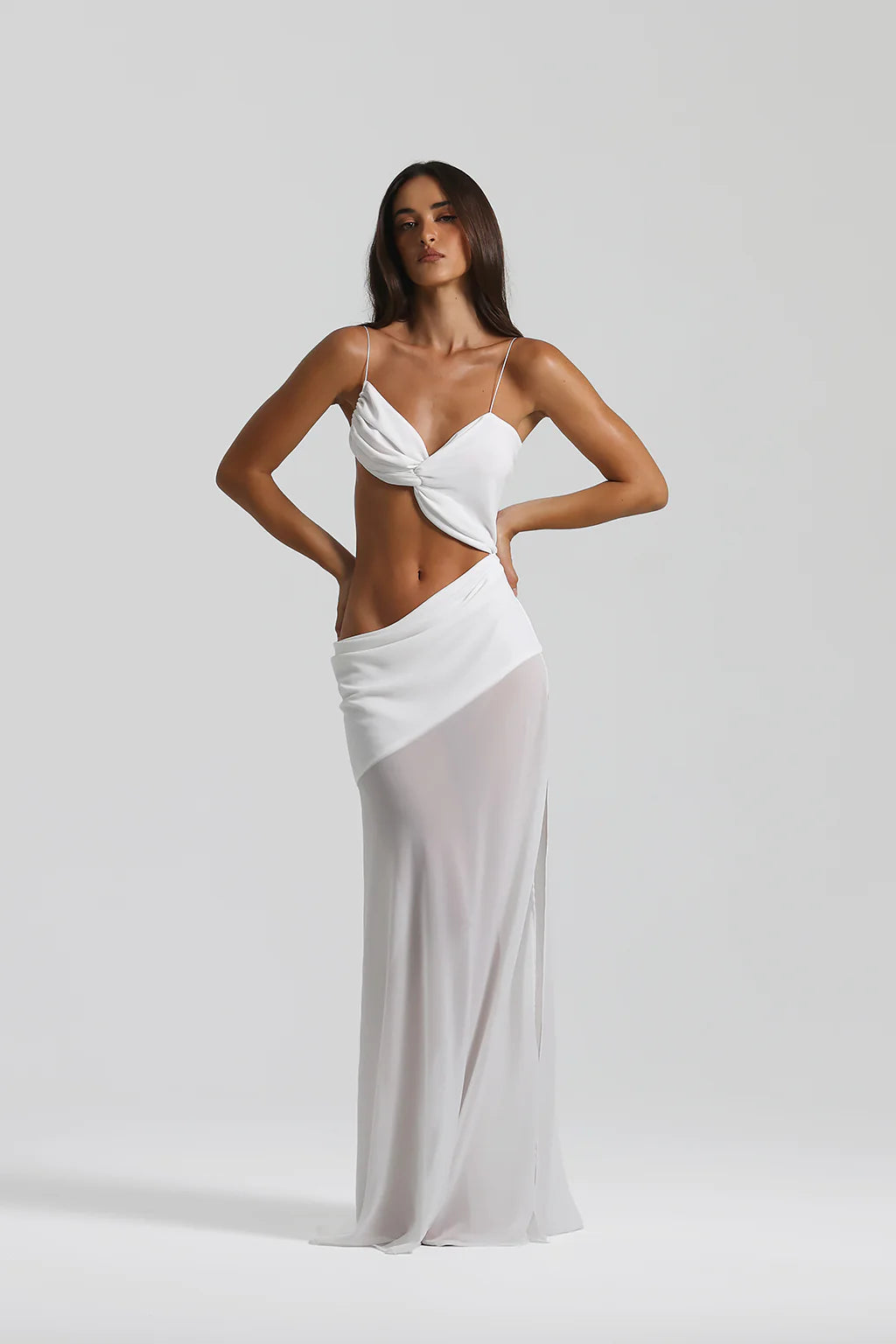 Signature Natalie Rolt cut-out style in crisp white — a high-end occasion piece made for formals, weddings and standout nights.