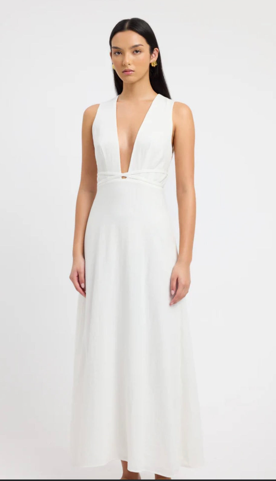 A timeless structured white maxi with Kookai’s signature contouring fit. Elegant deep-V neckline and clean silhouette — ideal for graduations, birthdays, engagements and dinners.